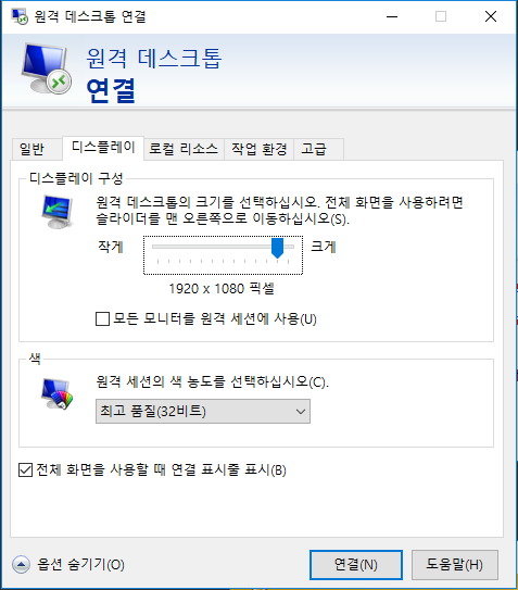 원격 데스크톱 연결 아래에 옵션 표시를 눌러주면,