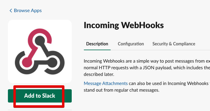 웹훅 앱 서비스 상세로 들어가면 Add to Slack을 클릭합니다.