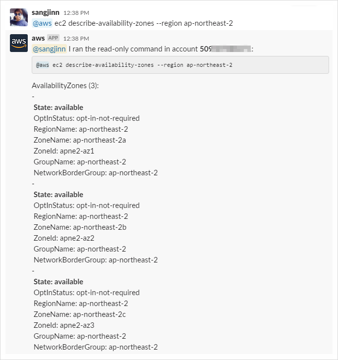 간단한 명령으로 서울 리전의 가용 영역을 슬랙에서 확인해봅니다.