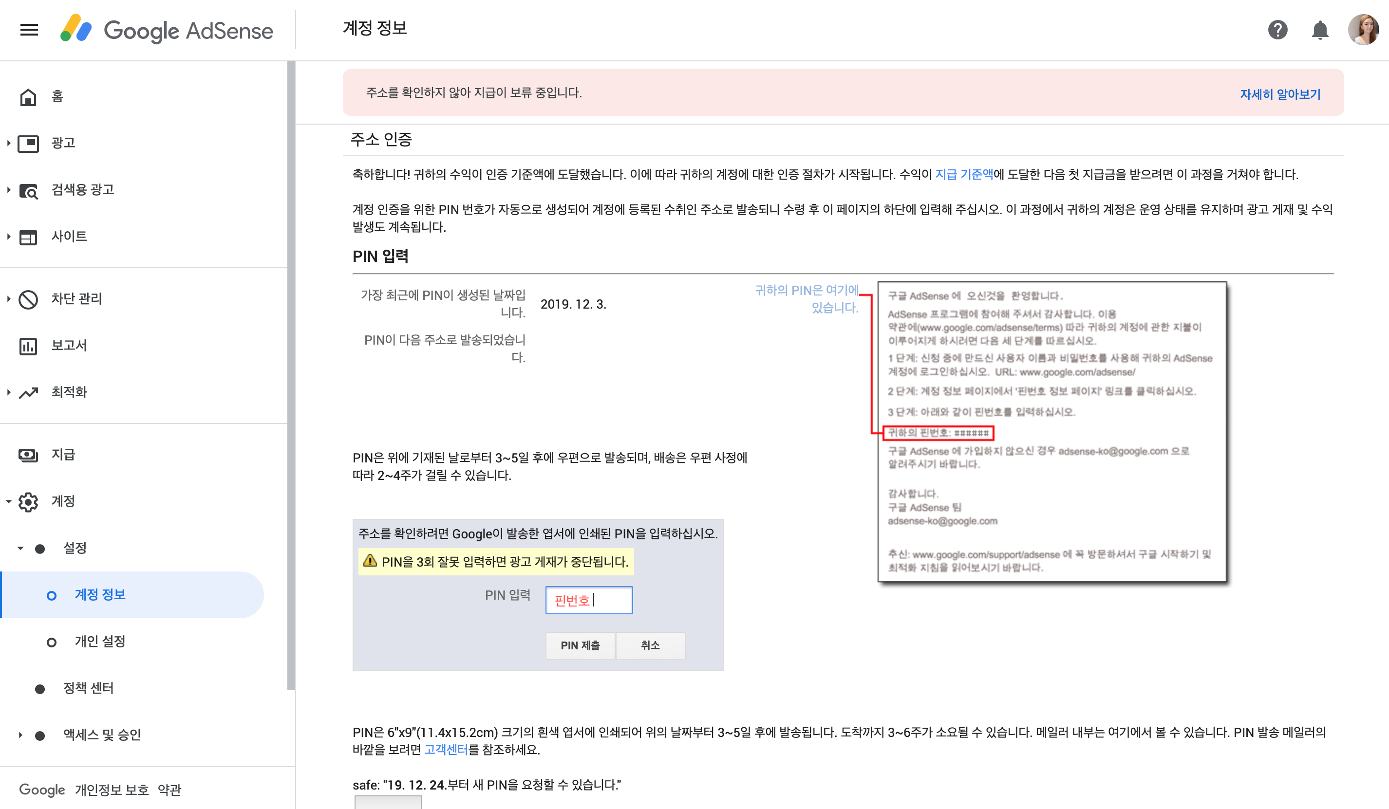 2019/12/05 - [재테크] - 구글 애드센스 10달러 달성, 핀 번호 받아요!
