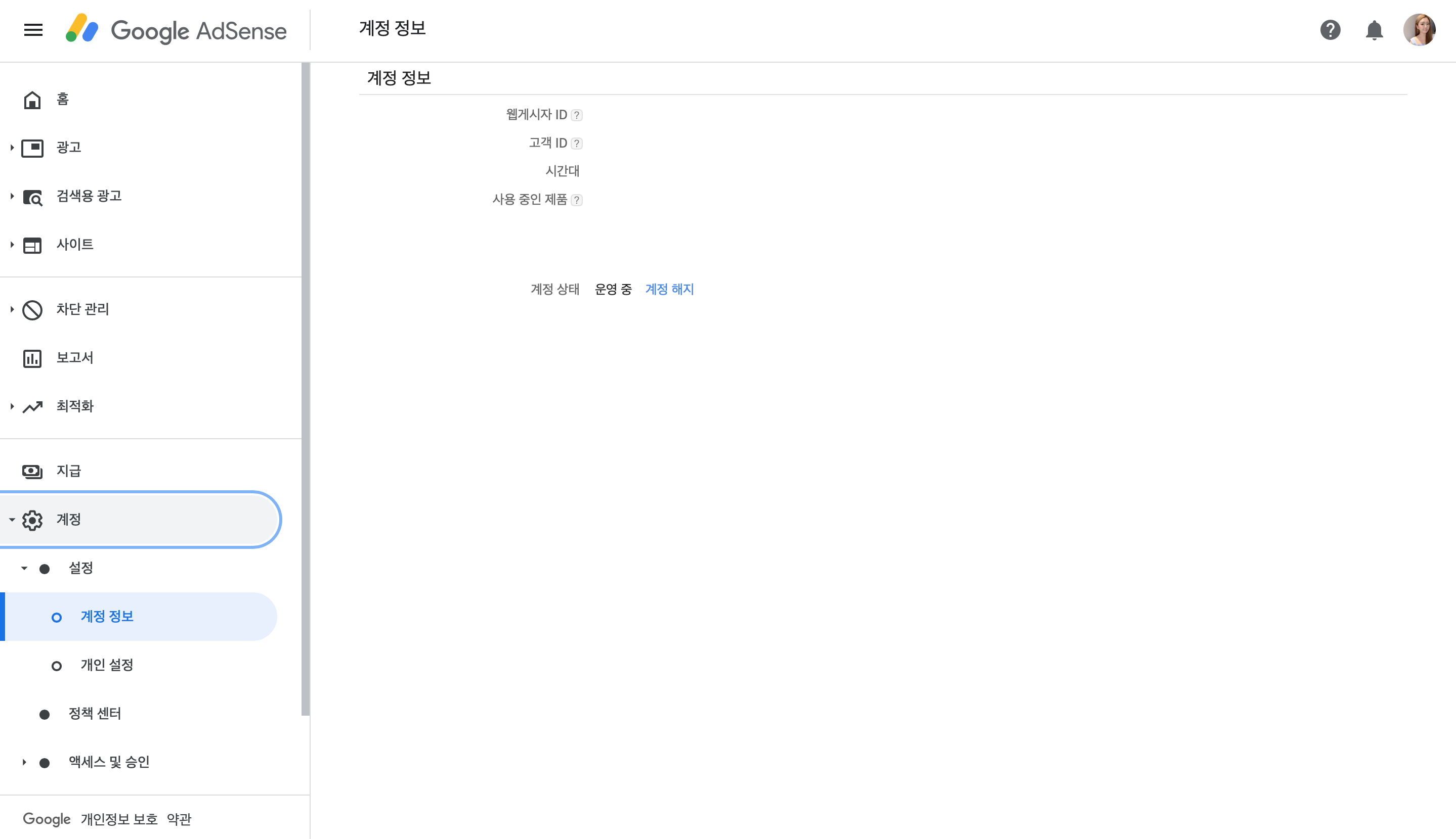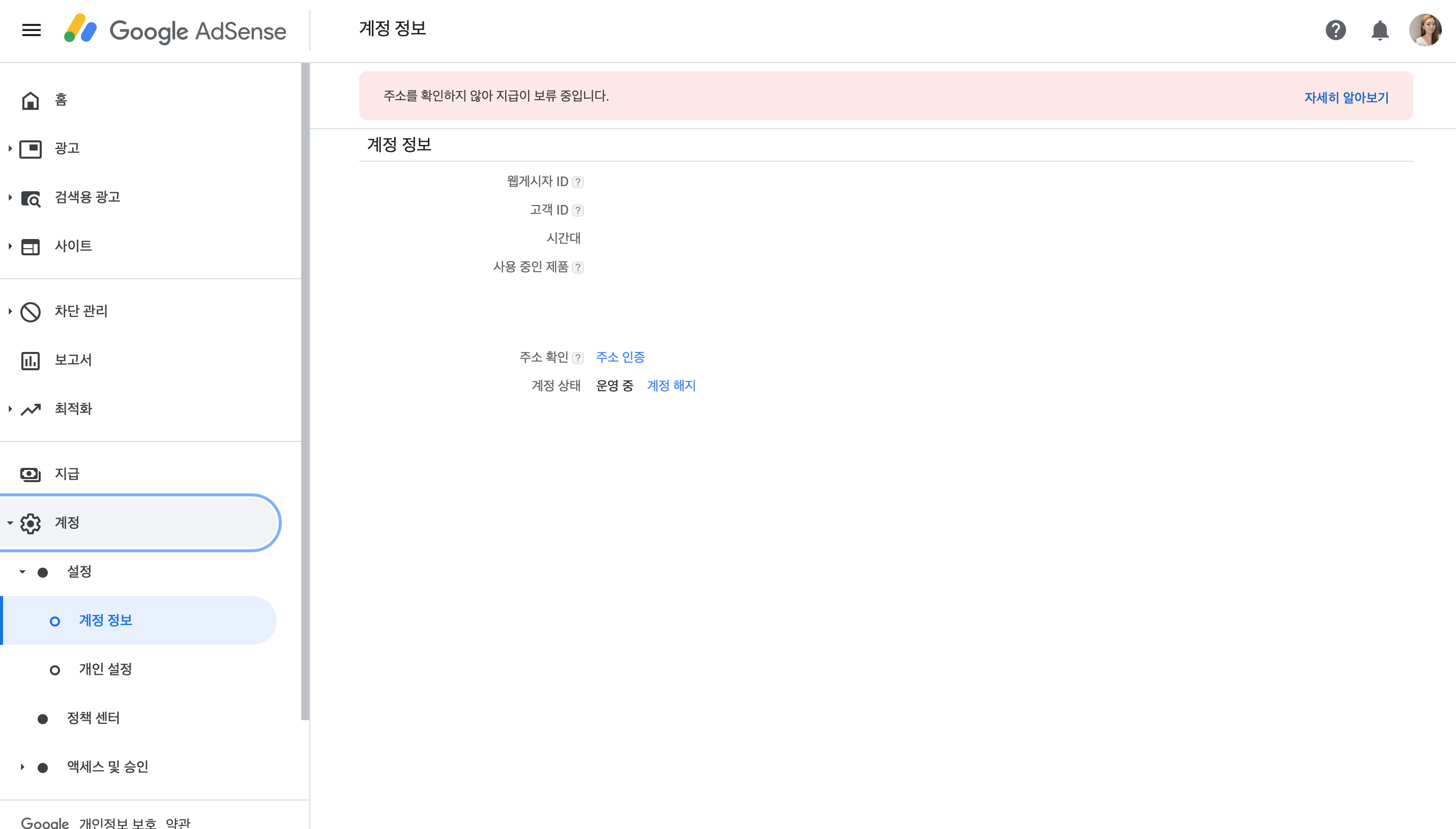 핀번호 인증을 완료하고 다시 한 번 계정 정보에 들어가보았더니 상단에 표시되었던 주의 메시지가 사라졌음을 확인할 수 있었습니다. 주소 인증 버튼도 사라졌네요. 드디어 지급계좌만 등록하게 되면 저의 외화계좌로 구글 월급을 받을 수 있게 되었습니다.