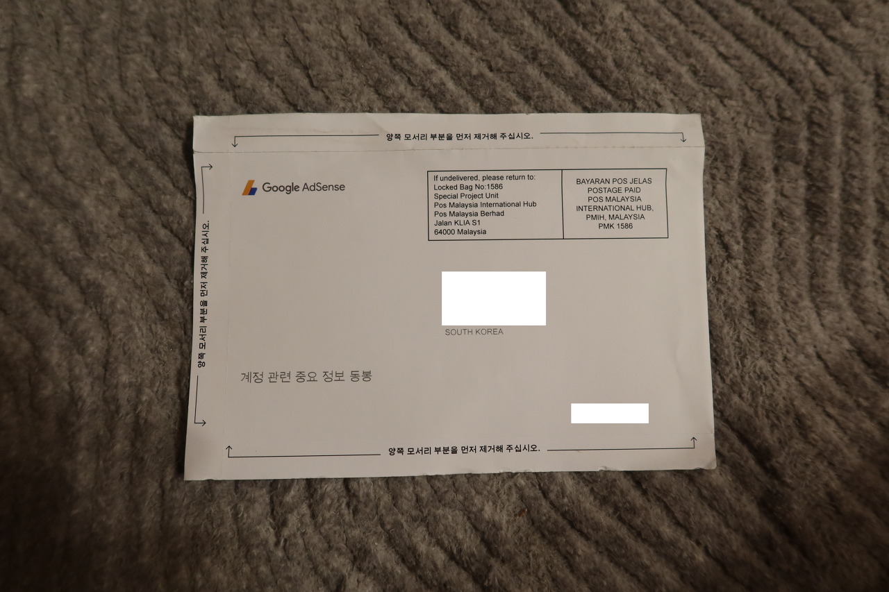 머나먼 말레이시아에서 날아온 구글 애드센스 핀번호 우편 입니다.