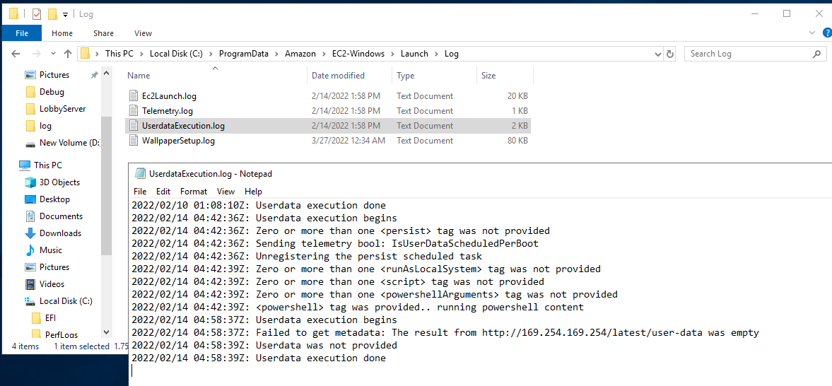 EC2Launch에 대한 로그 파일은 C:\ProgramData\Amazon\EC2-Windows\Launch\Log\UserdataExecution.log입니다.