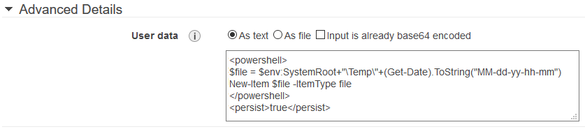 인스턴스를 시작할 때 인스턴스 시작 마법사의 3단계: 인스턴스 세부 정보 구성 페이지에 있는 고급 세부 정보, 사용자 데이터에서 스크립트를 지정합니다. 다음 이미지의 예제에서는 파일 이름의 현재 날짜 및 시간을 사용하여 Windows 임시 폴더에 파일을 생성합니다. <persist>true</persist>를 포함할 경우 인스턴스를 재부팅하거나 시작할 때마다 스크립트가 실행됩니다. 텍스트를 선택한 경우 Amazon EC2 콘솔에서 base64 인코딩을 자동으로 수행합니다.