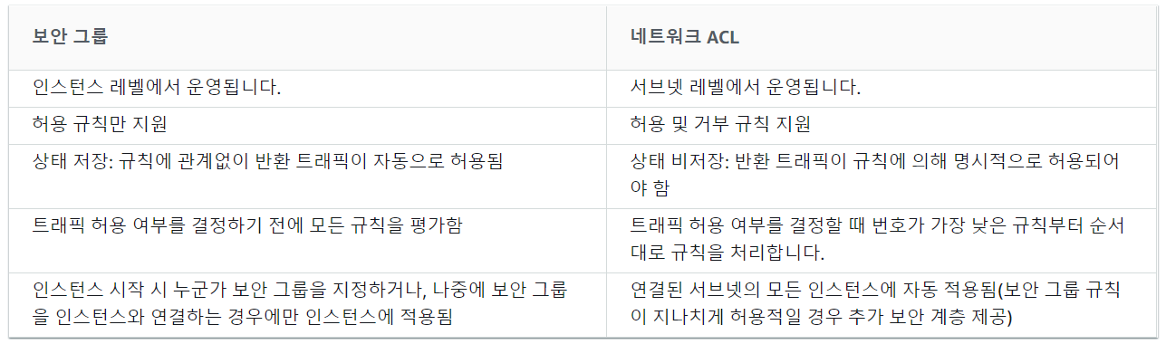마지막으로 Security Group과 Network ACL을 비교한 AWS VPC 설명서의 표를 가져왔습니다.