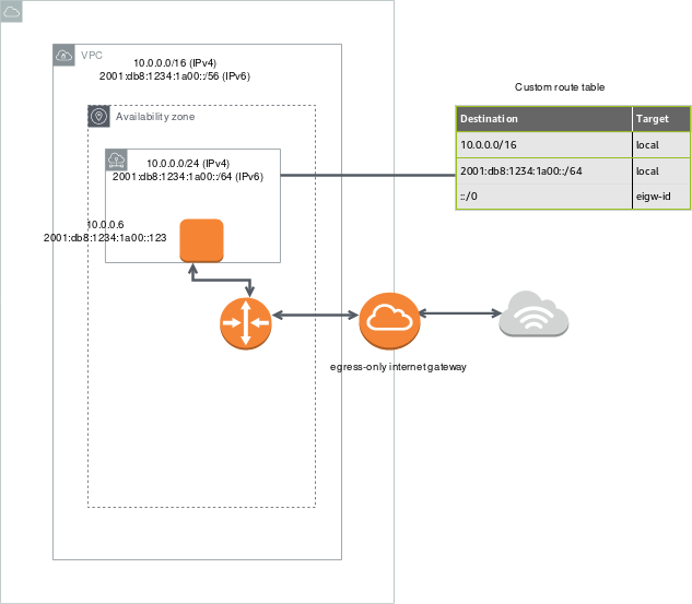 외부 전용 인터넷 게이트웨이는 수평 확장되고 가용성이 높은 중복 VPC 구성 요소로서, VPC의 인스턴스에서 인터넷으로 IPv6을 통한 아웃바운드 통신을 가능케 하되 인터넷에서 해당 인스턴스와의 IPv6 연결을 시작하지 못하게 할 수 있습니다.