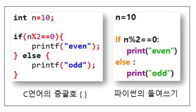 ⦁ 파이썬에서는 중괄호 대신 들여쓰기 규칙을 사용함. 들여쓰기 규칙을 지키지 못하면 에러가 발생합니다.