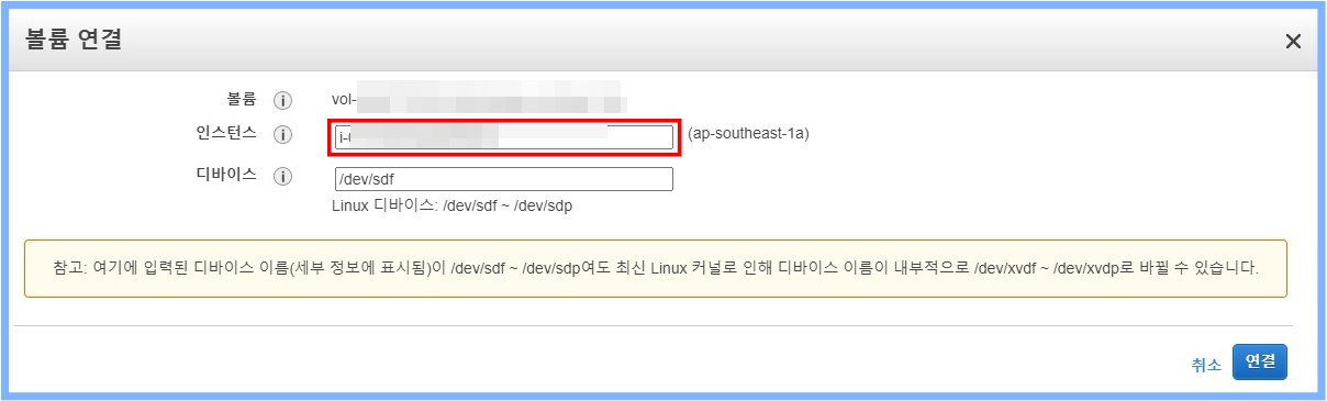 볼륨을 연결할 인스턴스(서버)를 선택하는 단계입니다