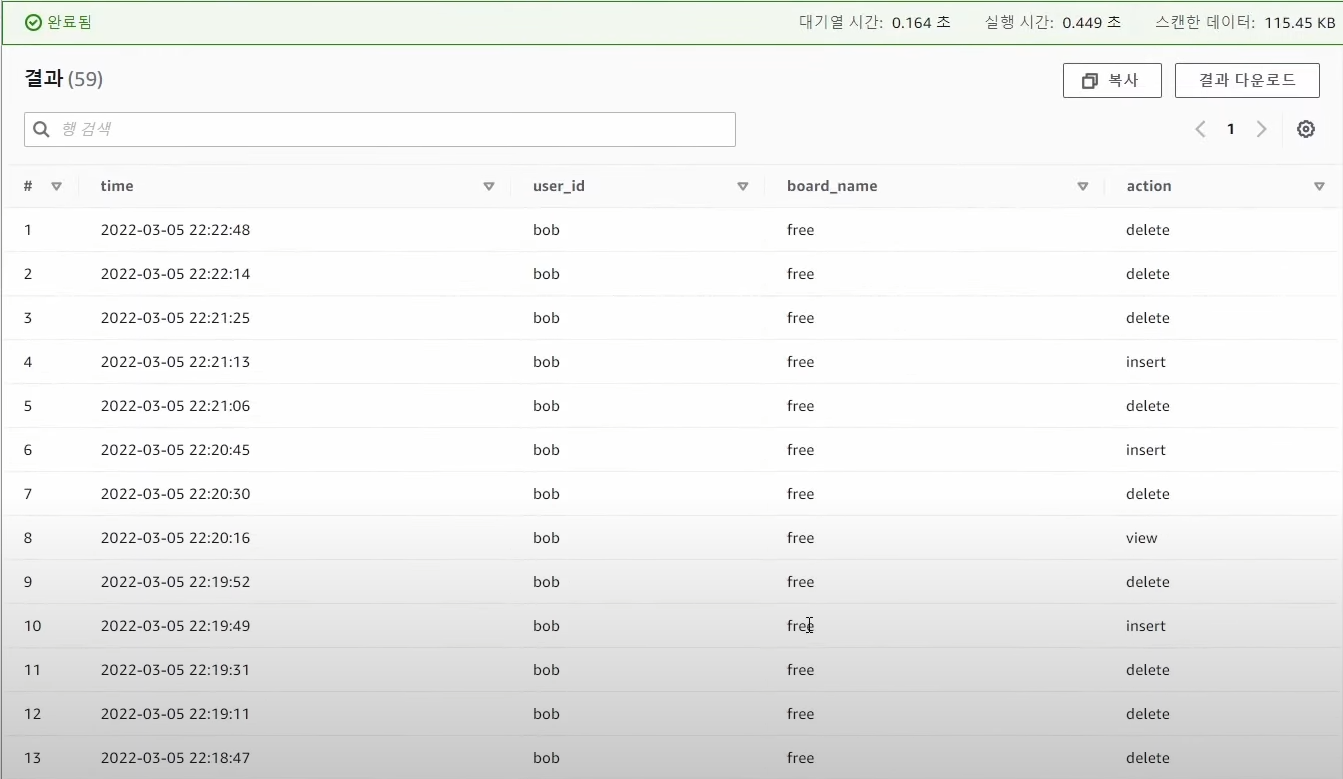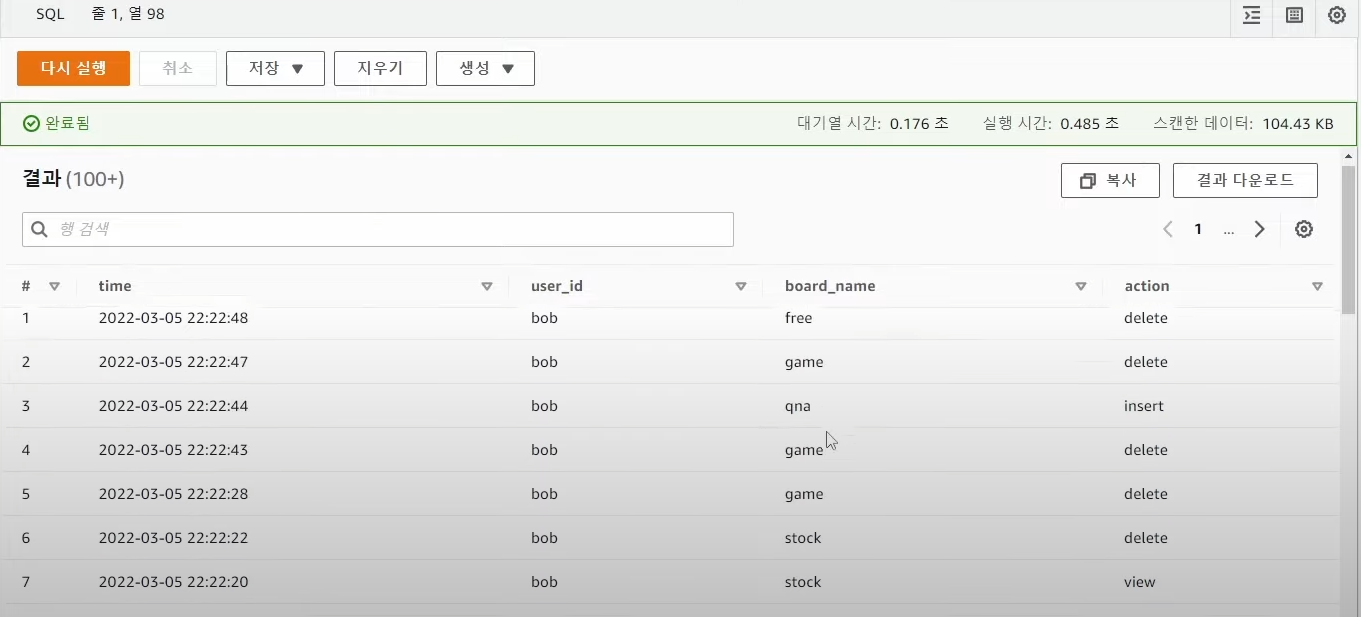 - bob 의 자유게시판 최근 실행내용 쿼리문 조회