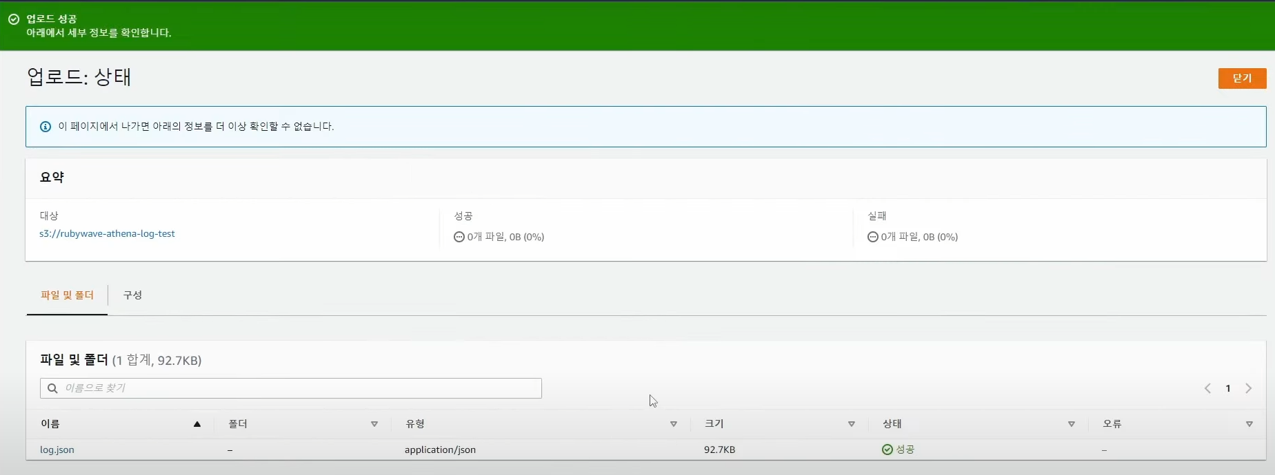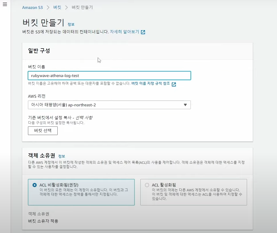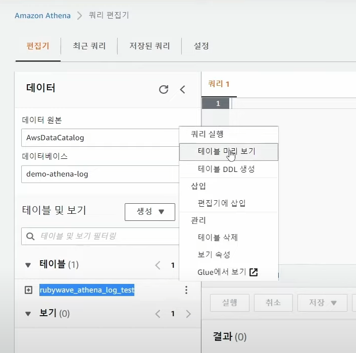 - 데이터베이스 -> 테이블 -> rubywave_athena_log_test 테이블 생성 (버킷명과 동일)