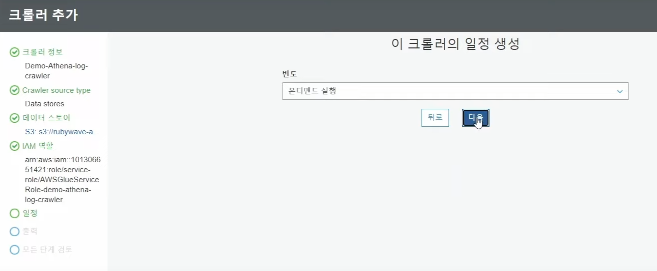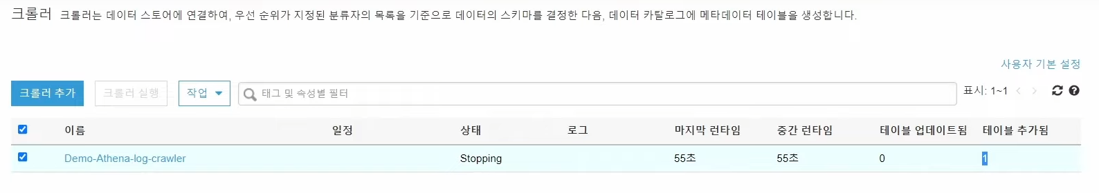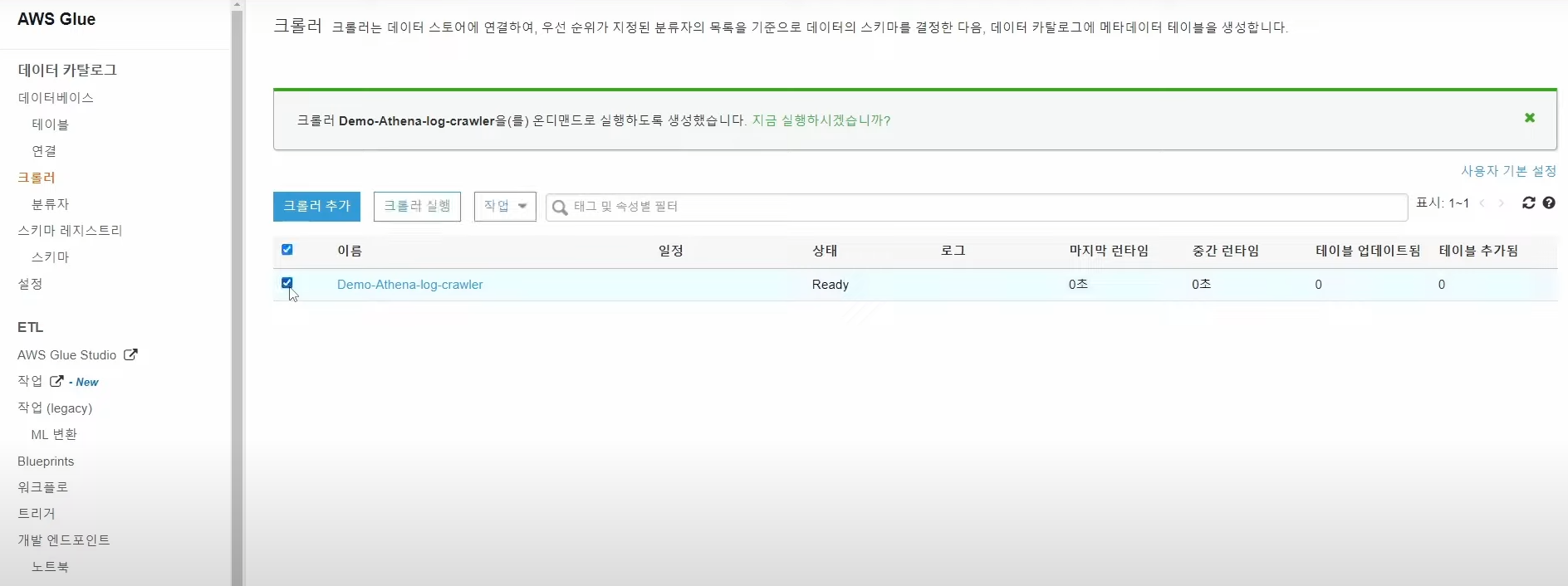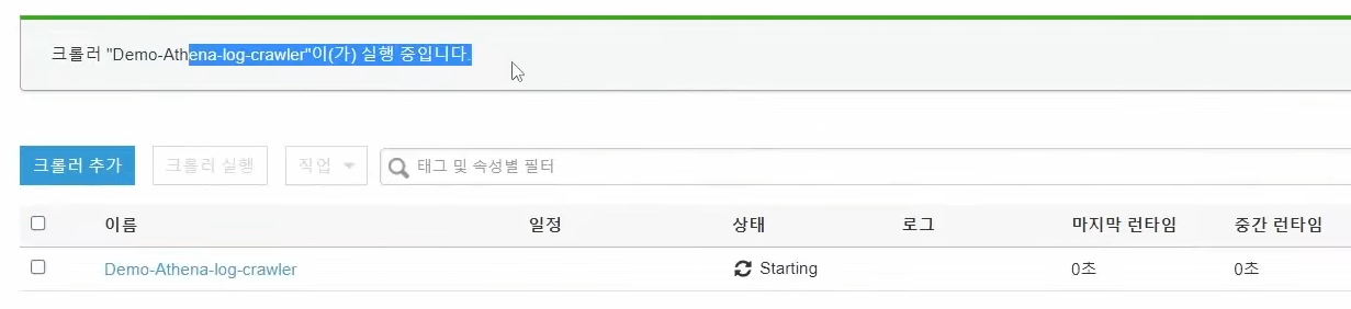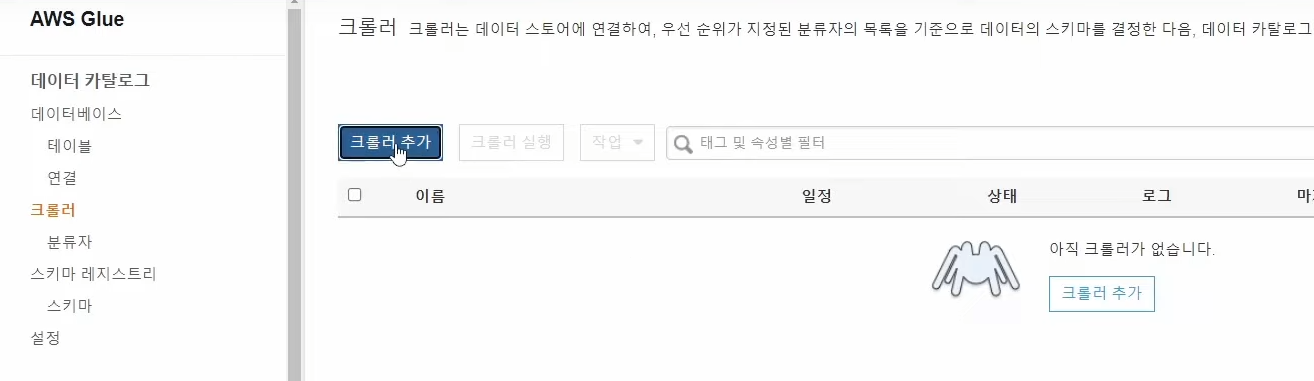 - 크롤러 생성 완료 --> 선택하고 실행 클릭