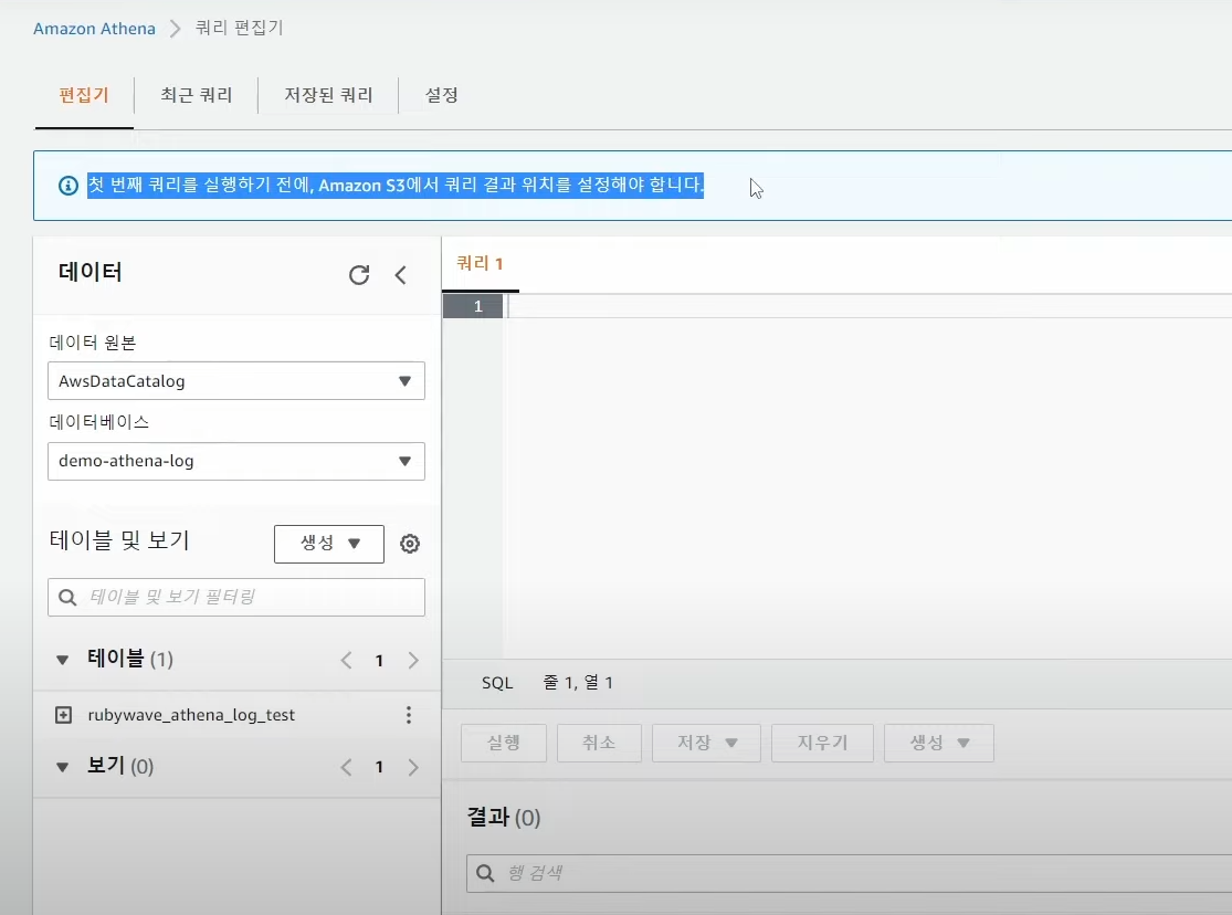 - 첫 번째 쿼리를 실행하기 전에, Amazon S3에서 쿼리 결과 위치를 설정해야 함.