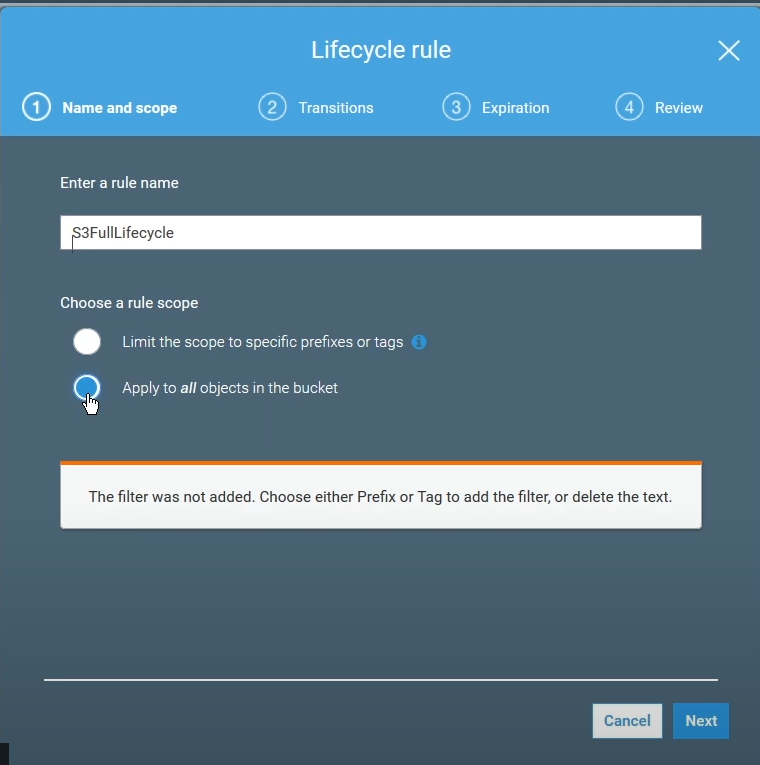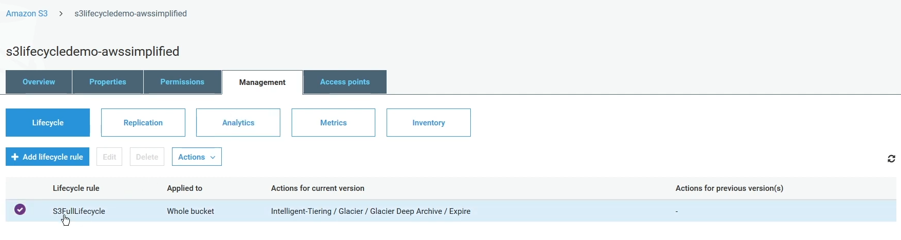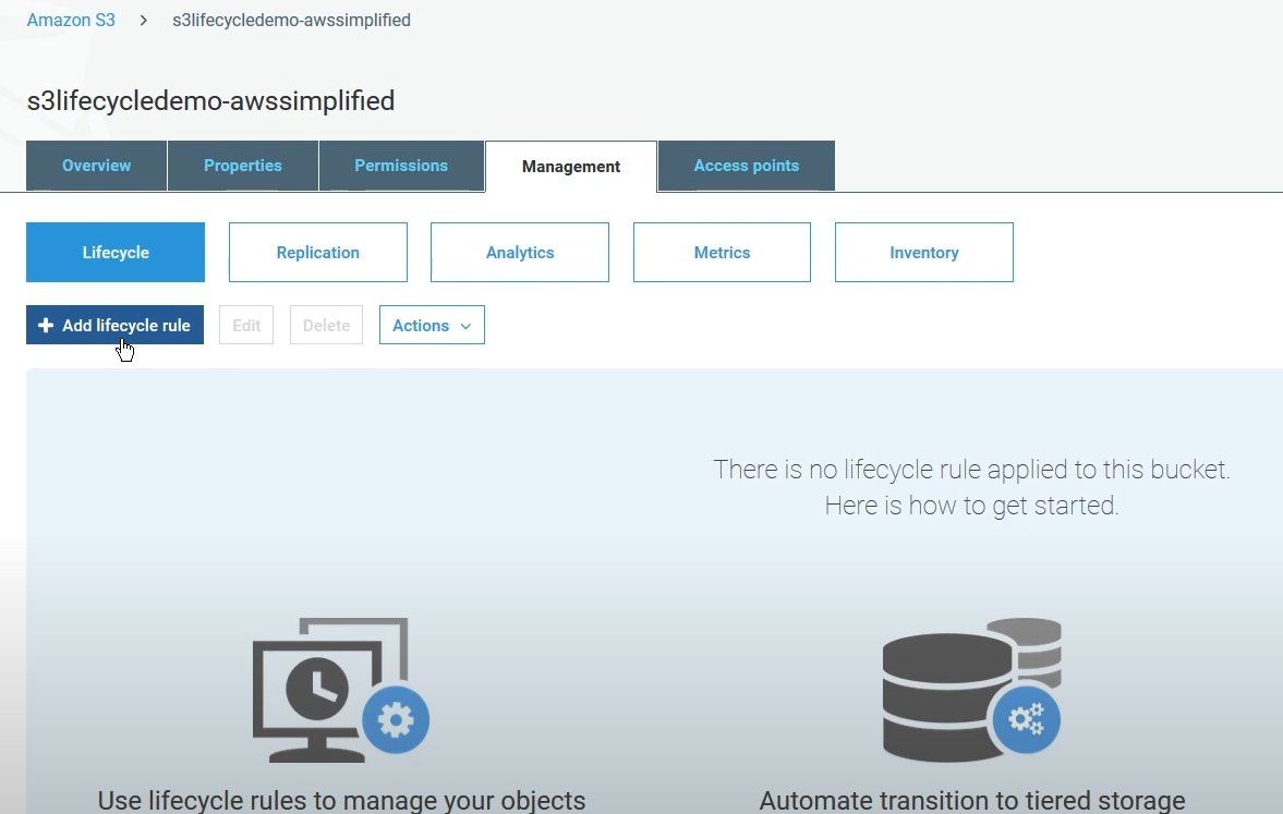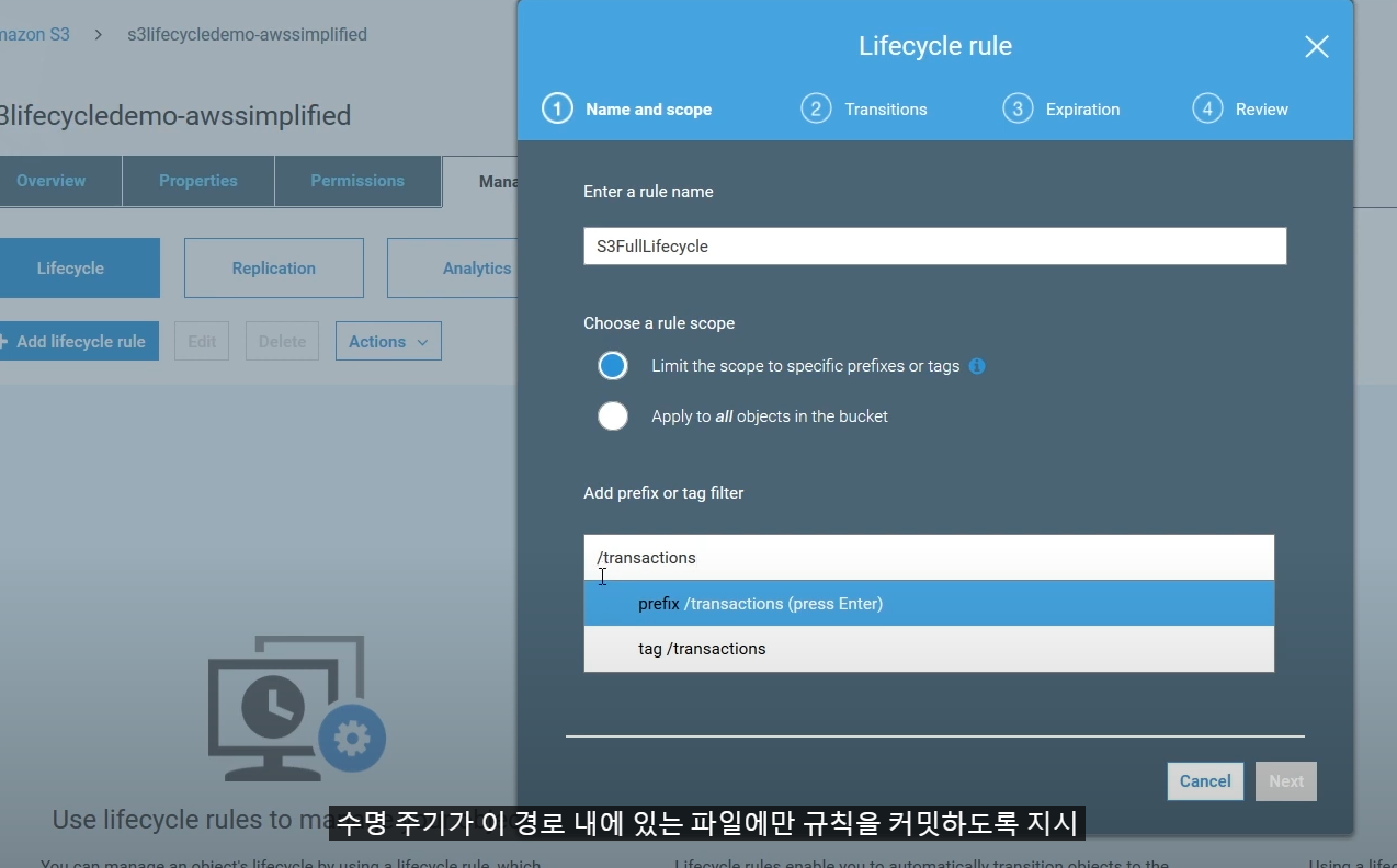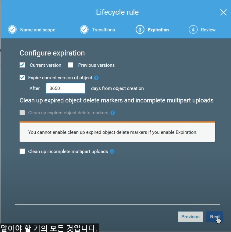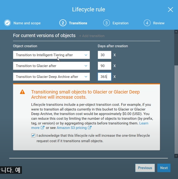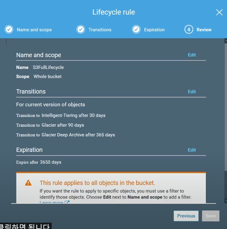 ## 해당 버킷 --> Management 클릭 --> 수명주기 규칙 추가 (클릭)