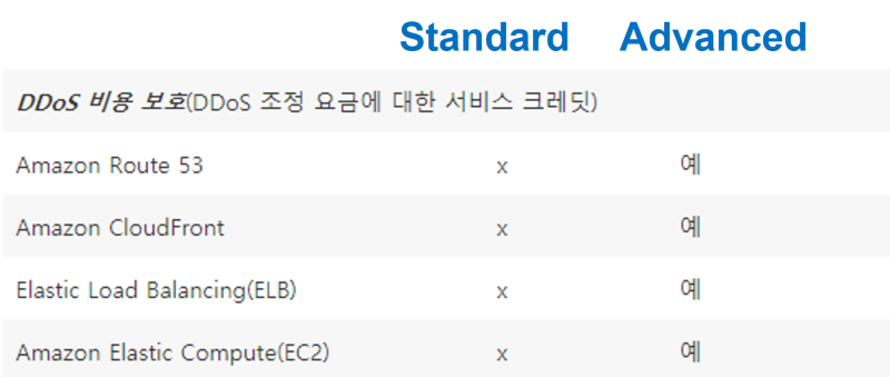 AWS Shield 는 Standard와 Advanced가 있는데, 지원하는 수준에 차이가 있습니다.