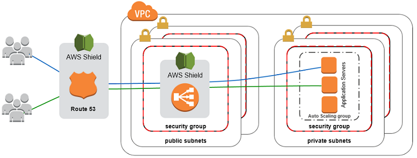 또한 AWS Shield 및 AWS WAF를 사용하여 클라우드 네트워크를 강화할 수도 있습니다. AWS Shield는 표준 및 고급의 두 가지 계층으로 제공되는 관리 형 DDoS 보호 서비스입니다. AWS Shield Standard는 결정적 패킷 필터링 및 우선 순위 기반 트래픽 형성과 같은 상시 감지 및 인라인 완화 기술을 적용하여 애플리케이션 다운 타임 및 지연 시간을 최소화합니다.