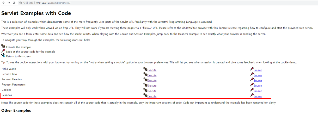 http://192.168.0.167/examples/servlets/ 에서 Sessions 을 예로 진행