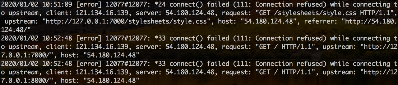 마지막으로 connection 이 연결이 끊겼는지 확인하겠습니다. nginx 설정 할 때 에러는 /var/log/nginx/proxy/error.log 에 저장하도록 했으니 아래 명령어를 이용해면 어떤 에러가 발생했는지 확인 할 수 있습니다.