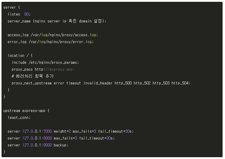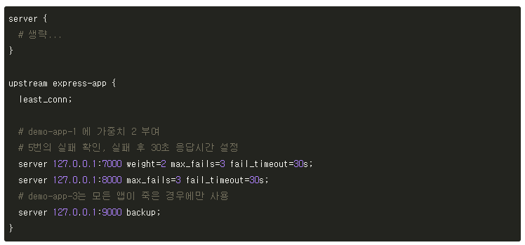 - max_fails=n: n으로 지정한 횟수만큼 실패가 일어나면 서버가 죽은 것으로 간주한다.