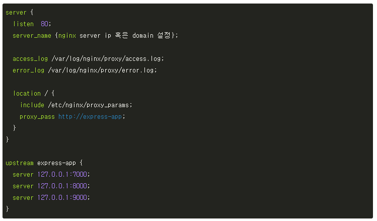 즉 저희는 express-app 이라는 upstream 을 만들고 각각의 앱에 연결한 다음 proxy_pass 를 이용해 80 포트로 들어왔을 때 이 upstream 으로 전달하도록 하겠습니다.