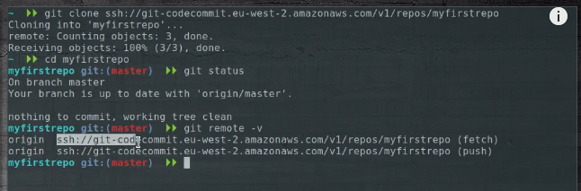 - $ git clone ssh://git-codecommit.ap-northeast-2.amazonaws.com/v1/repos/OKY