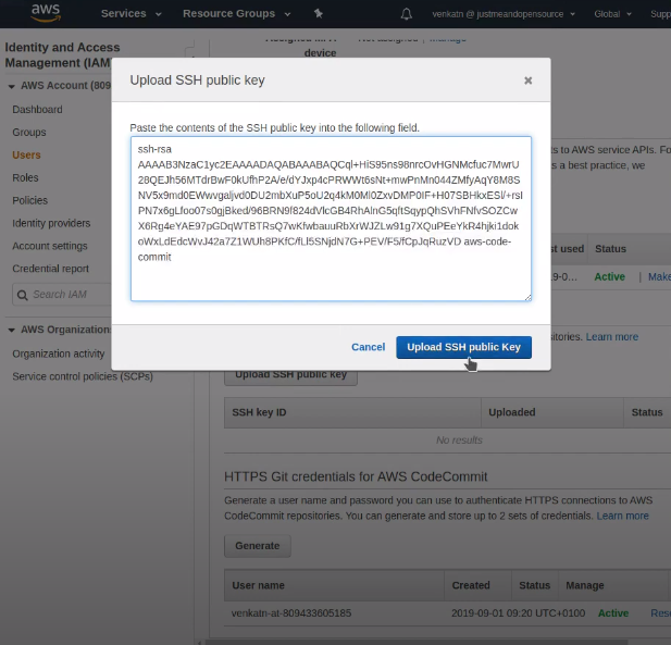 4. 사용자 IAM으로 가서 Upload SSH Public key 삽입