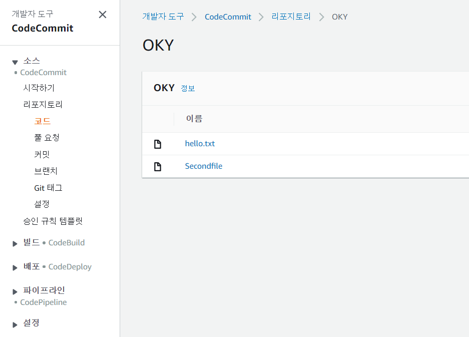 - $ git clone https://git-codecommit.ap-northeast-2.amazonaws.com/v1/repos/OKY