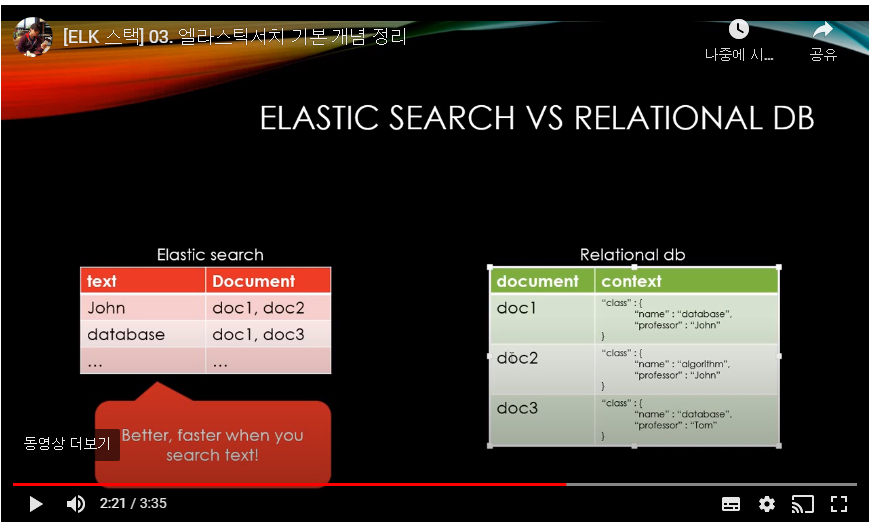 - 엘라스틱서치는 RDB에 비해 검색속도가 매우 빠르다.