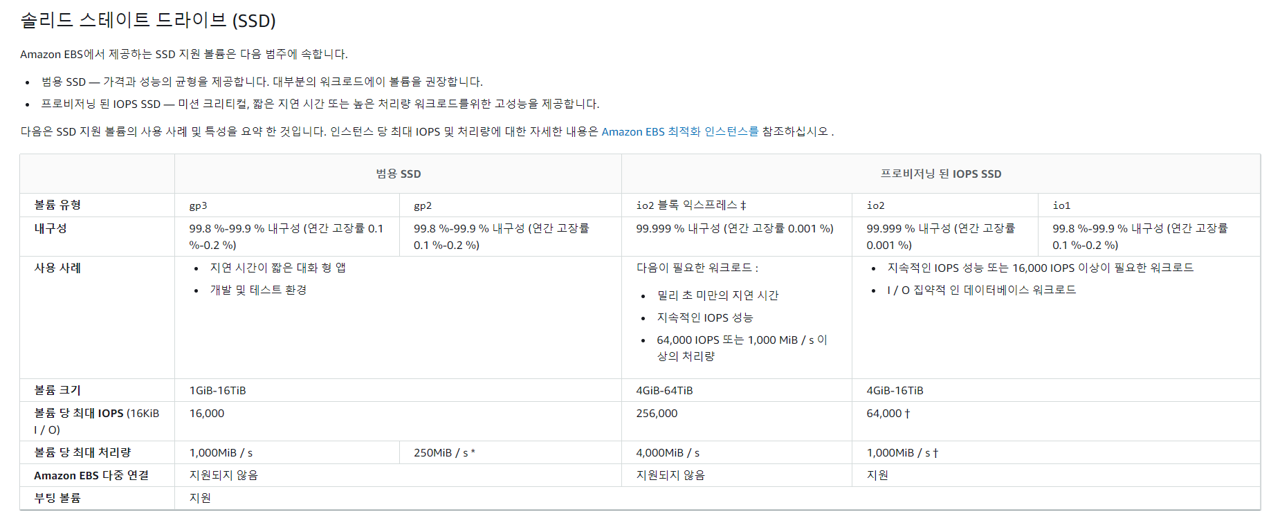 Amazon EBS는 성능 특성과 가격이 다른 다음과 같은 볼륨 유형을 제공하므로 애플리케이션 요구 사항에 맞게 스토리지 성능과 비용을 조정할 수 있습니다. 볼륨 유형은 다음 범주에 속합니다.