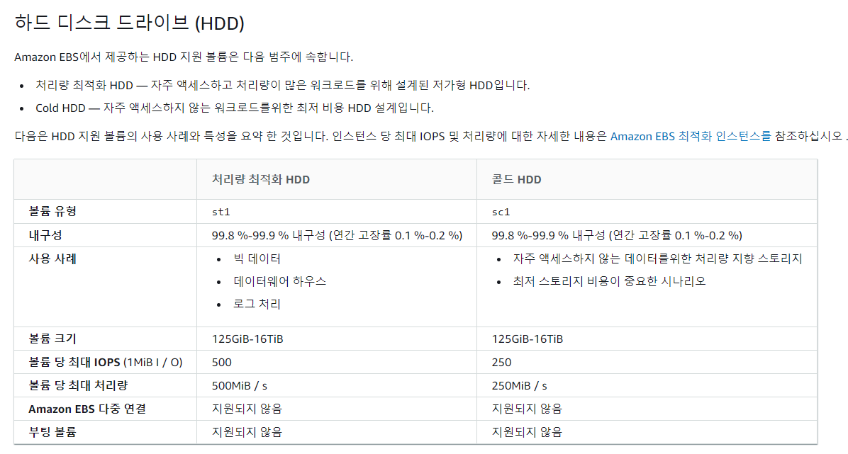 - 이전 세대 — 데이터에 자주 액세스하지 않고 성능이 중요하지 않은 소규모 데이터 세트가있는 워크로드에 사용할 수있는 하드 디스크 드라이브입니다. 대신 현재 세대 볼륨 유형을 고려하는 것이 좋습니다.