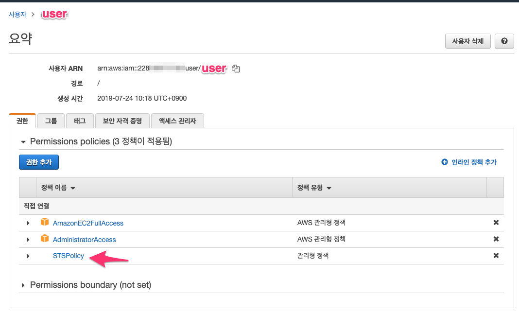 AWS 관리 콘솔 > IAM > 사용자 > user > 요약 > 권한 추가