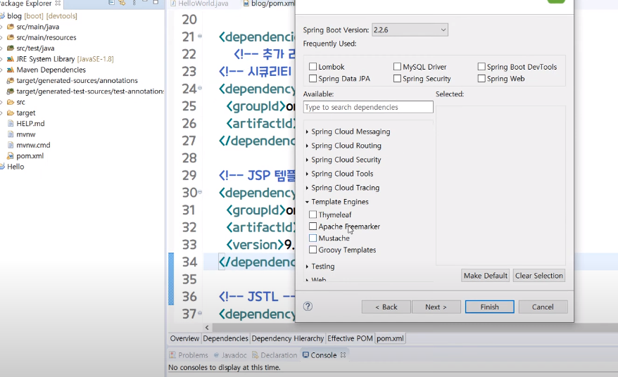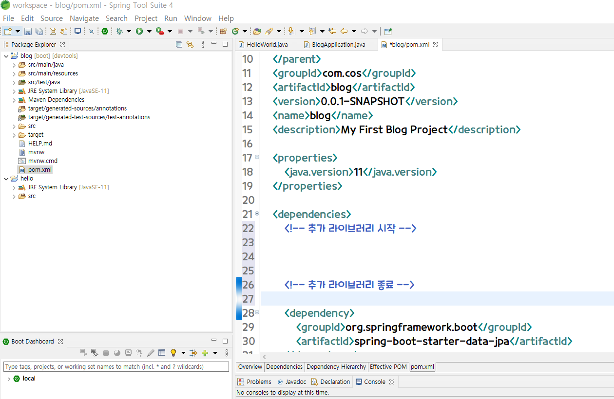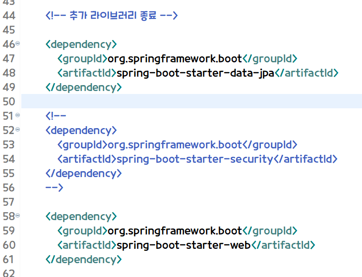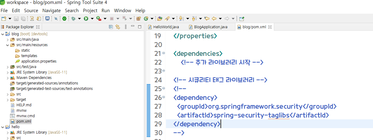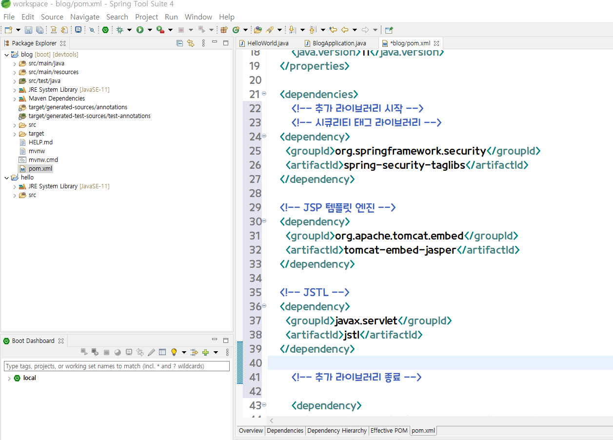 - pom.xml 클릭 후, <!-- 추가 라이브러리 시작 --> 삽입