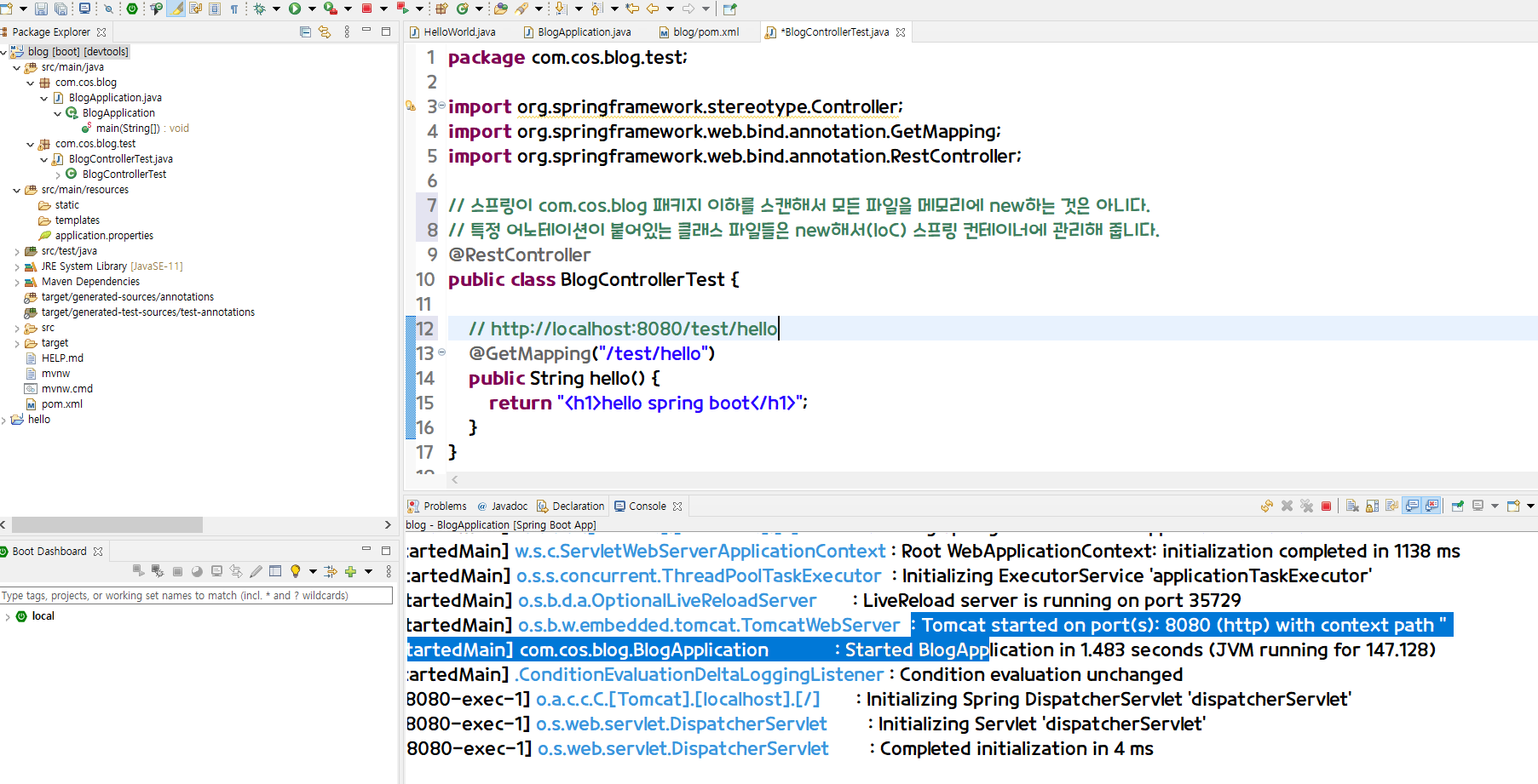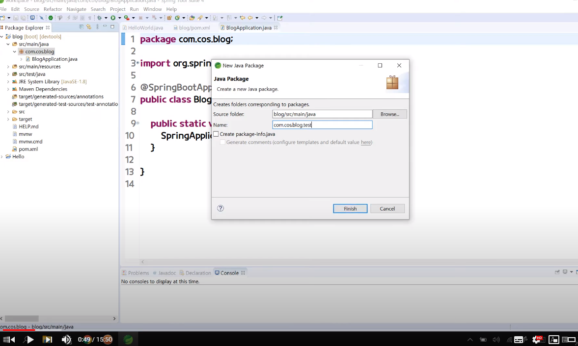 - com.cos.blog 선택 -> NEW -> Package -> com.cos.blog.test 생성