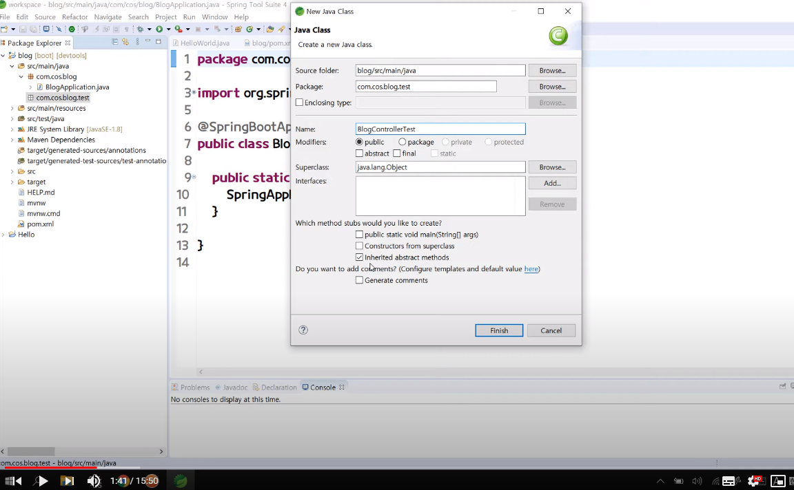 - com.cos.blog.test 선택 -> NEW -> Class -> BlogControllerTest 생성