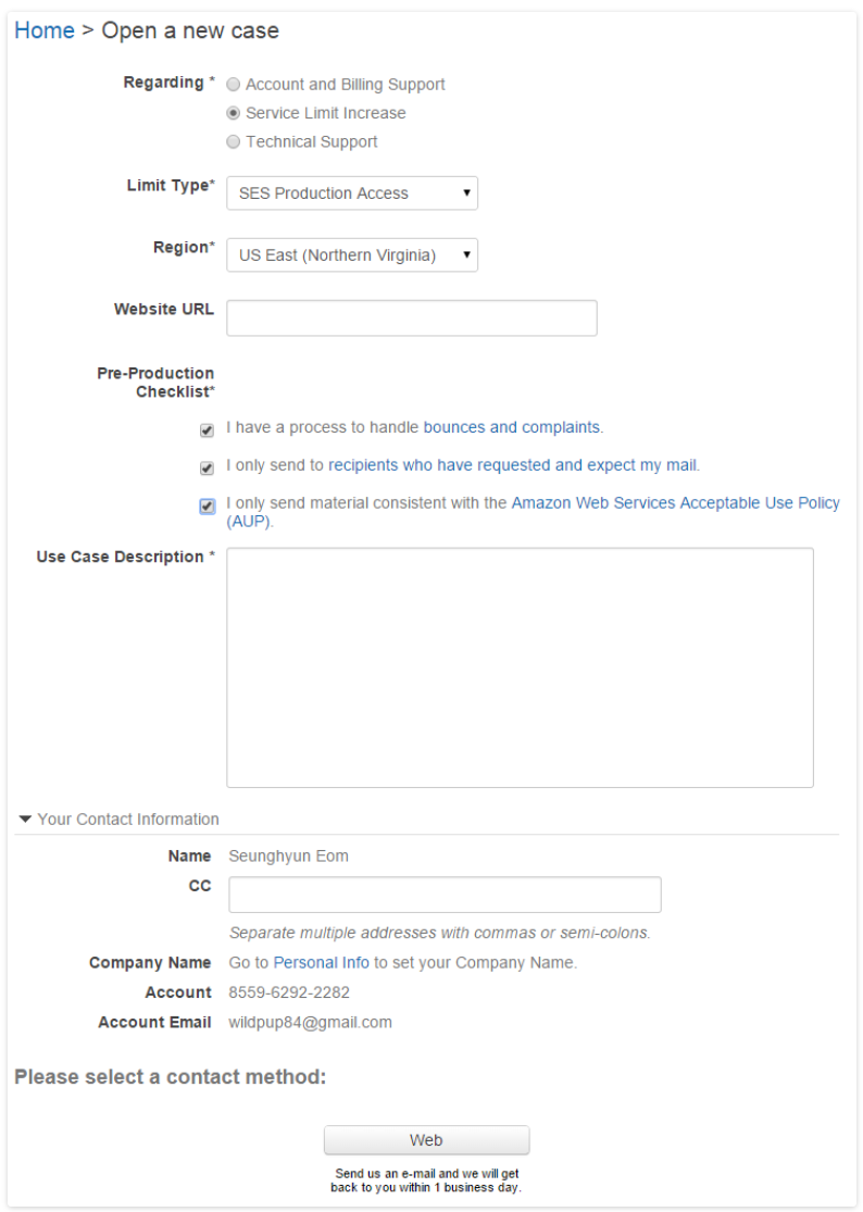 위와 같이 요청 내용을 알맞게 채운다. *로 체크된 부분은 필수 입력 항목이며 Pre-Production Checklist는 약관에 해당되므로 모두 체크해야 한다. Use Case Description은 사용 목적을 영문으로 입력한다. 본 포스트에서는 서비스 도입을 위한 사전 테스트라고 적어 보냈다. 입력이 완료되면 하단의 Web 버튼을 클릭한다.