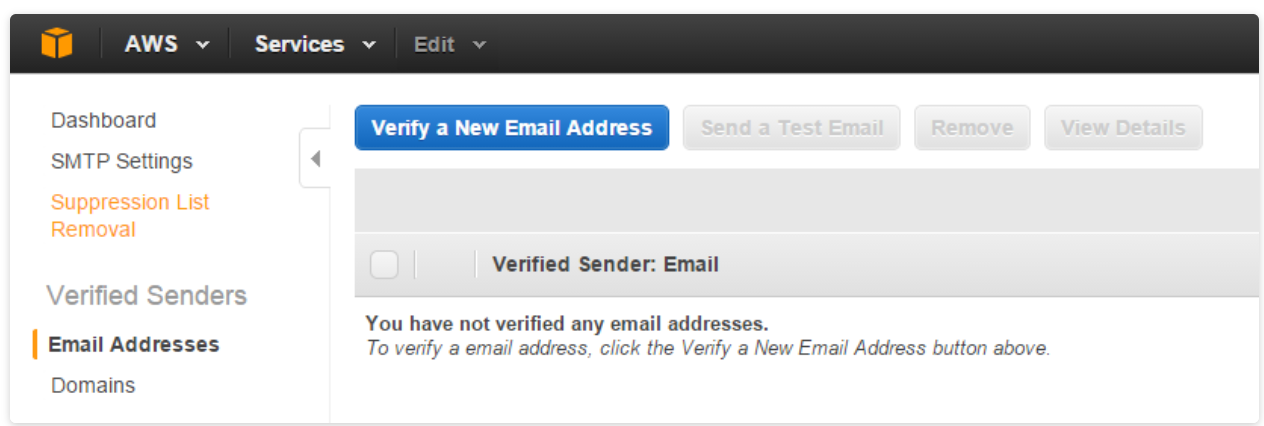 왼쪽에 Verified Senders 아래에 Email Addresses를 클릭하고 상단에 Verify a New Email Address 버튼을 클릭한다.