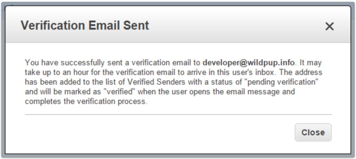 | <?php require 'vendor/autoload.php'; use Aws\Ses\SesClient; $client = SesClient::factory(array( 'profile' => 'default', 'region' => 'us-east-1' )); $result = $client->sendEmail(array( 'Source' => 'developer@wildpup.info', 'Destination' => array( 'ToAddresses' => array('wildpup84@gmail.com') ), 'Message' => array( 'Subject' => array('Data' => 'Hello SES!'), 'Body' => array('Text' => array('Data' => 'Hello SES Body')) ) )); ?> |