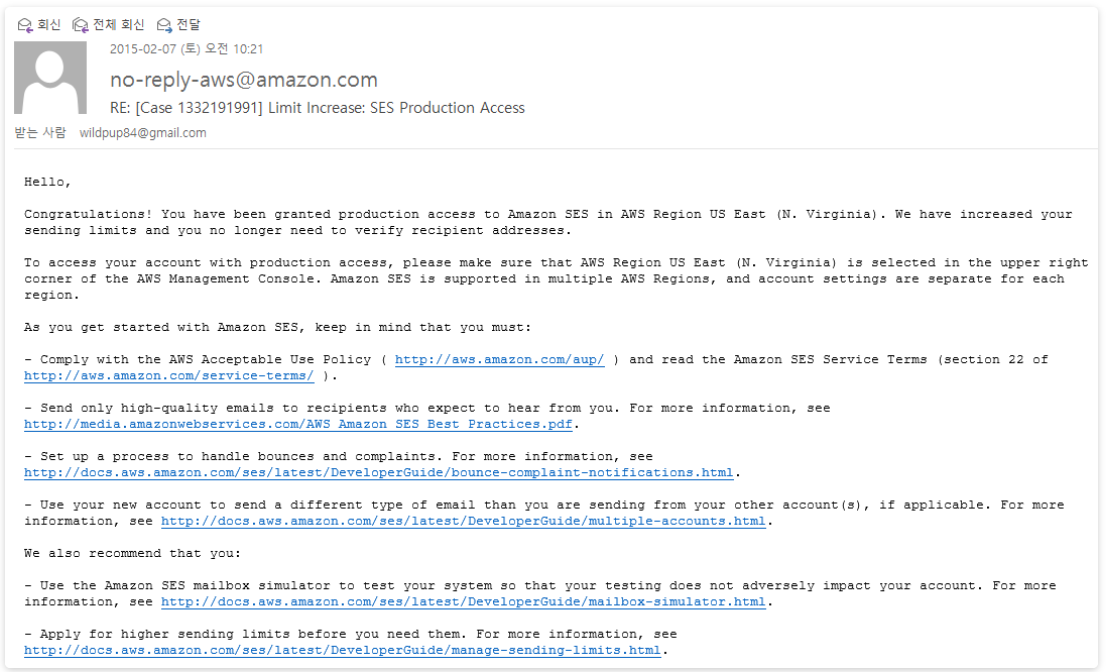 사실 메일을 이용한 서비스를 구축하다 보면 메일의 발송 신뢰성을 신경 쓸 수밖에 없는데 서버나 네트워크 구성 혹은 IP 주소의 신뢰성 같은 인프라 문제 등 신경써야 할 부분이 많은 것은 사실이다. SES는 이런 부분에 대해서 많은 도움을 제공한다.