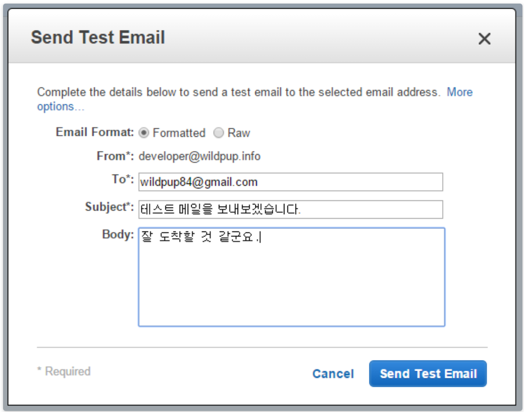 위와 같이 테스트 메일 보내기 창이 뜨면 항목을 입력한다. 역시 * 표시가 되어 있는 항목은 필수 입력 사항이다.