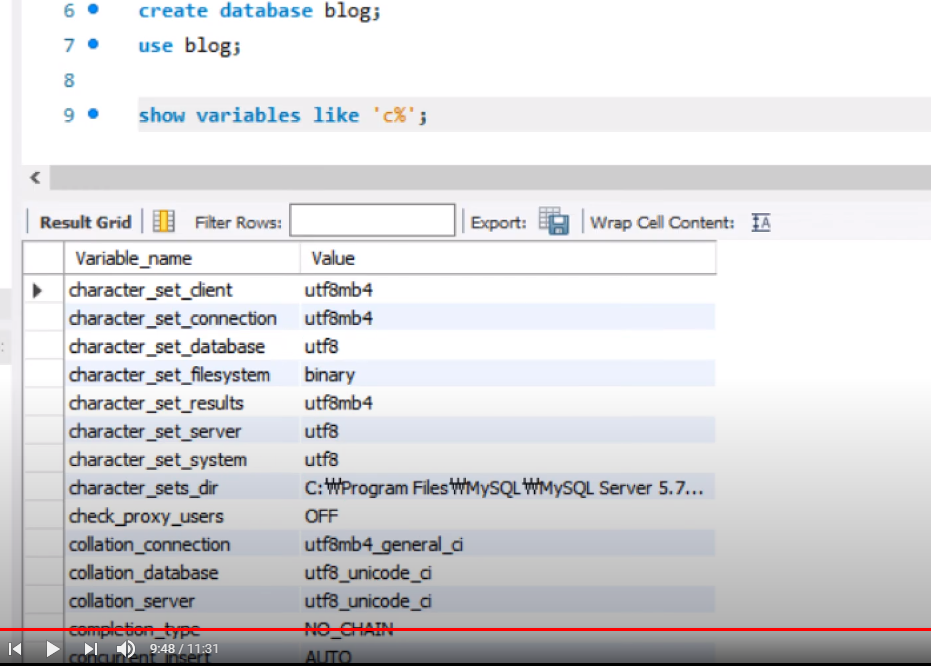 - Character_set_database (utf8 인지 확인)