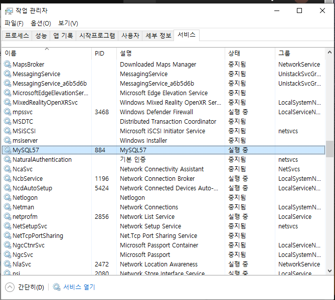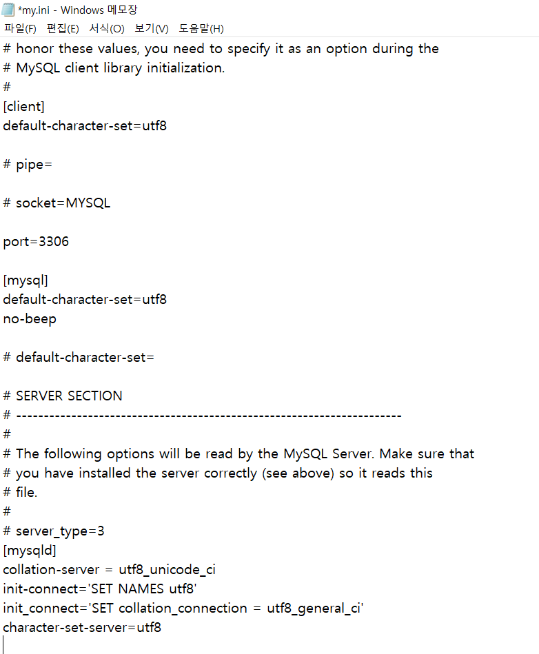 - my.ini 편집 및 저장 후 MySQL 재시작 (한글 설정 적용)