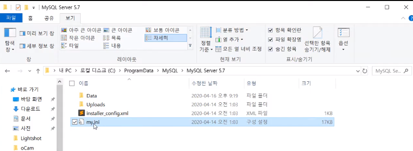 - 파일탐색기 -> 보기(숨김항목 체크) -> ProgramData -> MySQL -> MySQL Server5.7 -> my.ini 편집 (메모장 관리자 권한으로 열기)