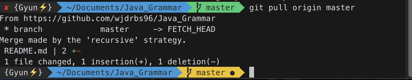 git pull이란 원격 저장소의 정보를 가져오면서 자동으로 로컬 브랜치에 병합(Merge)까지 수행해주는 명령어이다.