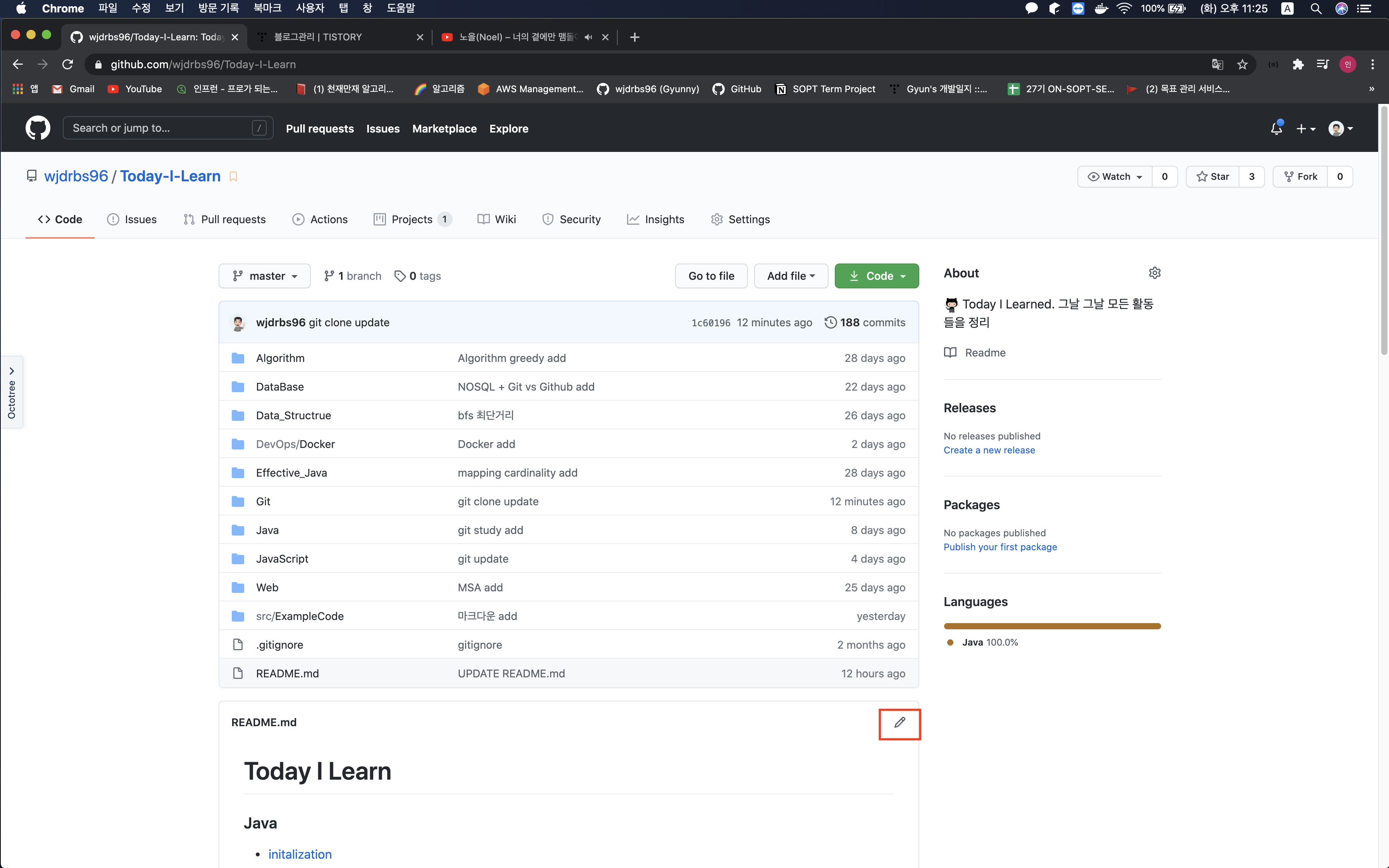 위의 순서대로 명령어를 통해 로컬 저장소의 내용을 원격 저장소에 반영해보자.