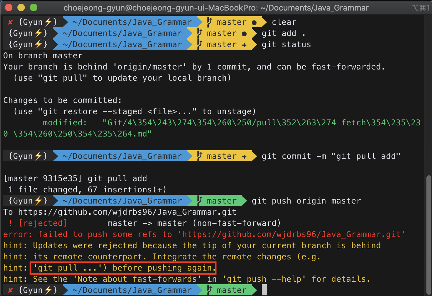 그러면 push를 하기 전에 pull을 하라는 거절 메세지를 볼 수 있다.