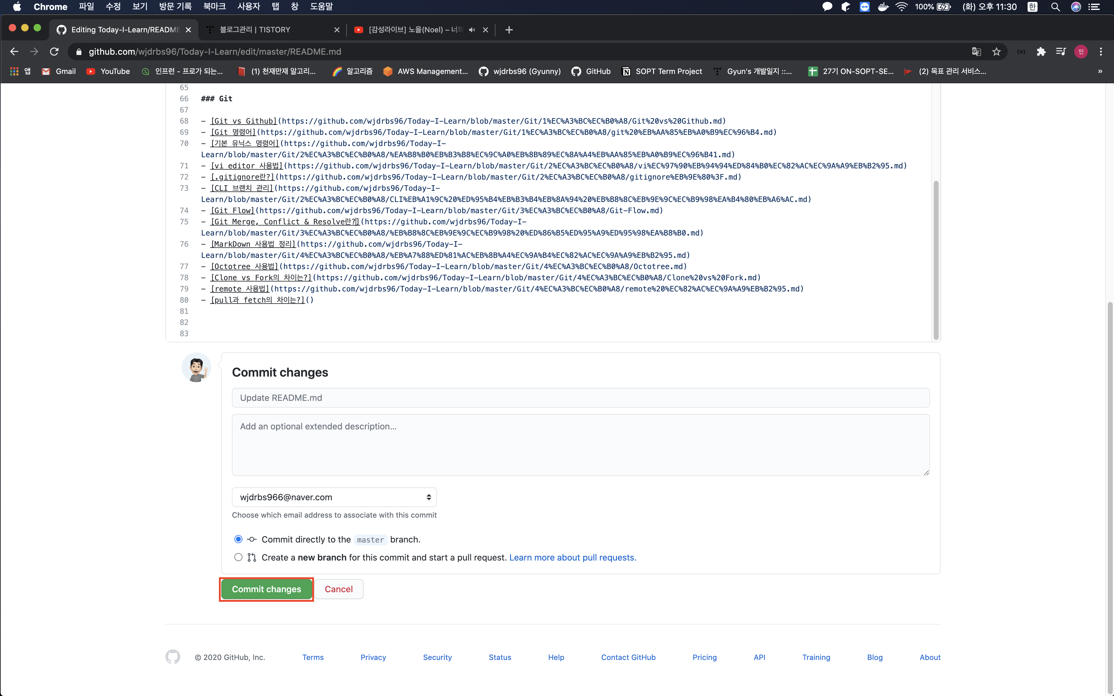 그리고 간단히 수정을 한 후에 Commit changes 버튼을 눌러서 변경사항을 반영해보자.