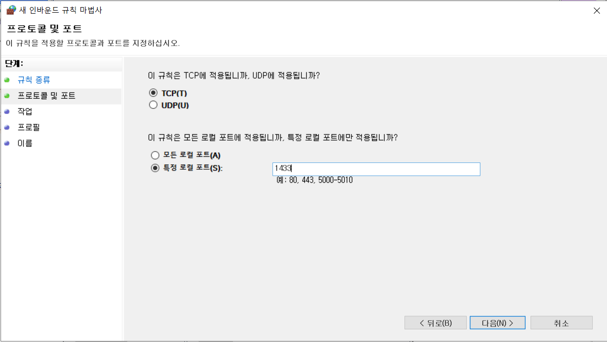프로필 및 포트 항목 TCP, 특정 로컬포트 1433