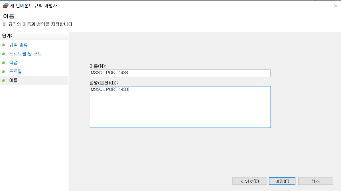 이름은 MSSQL 이니 MSSQL PORT 1433으로 하고 마침을 누르면 포트가 오픈된다