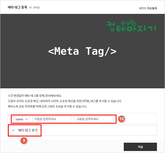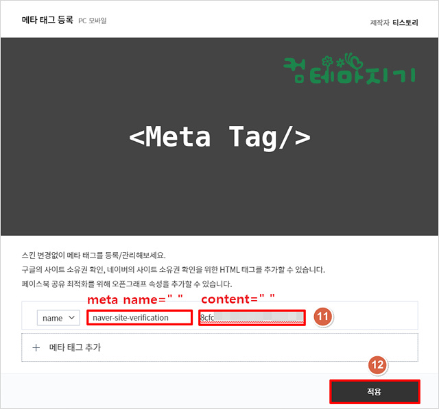 ▼ 메타태그 내용을 입력할 때, 11. meta name= 따옴표("")안의 내용을 복사해서 붙이고, content= 따옴표("")안의 내용을 복사해서 붙이기한 다음, 12. 적용을 클릭합니다.