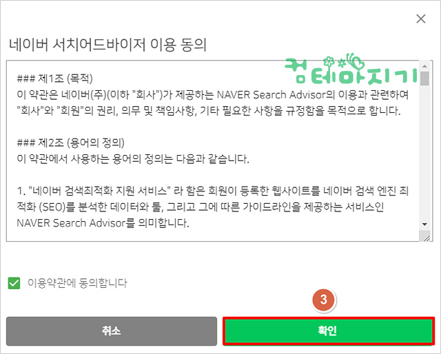 ▼ 네이버 서치어드바이저 이용동의 화면에서 이용약관에 동의합니다. 체크한 다음, 3. 확인을 클릭합니다.