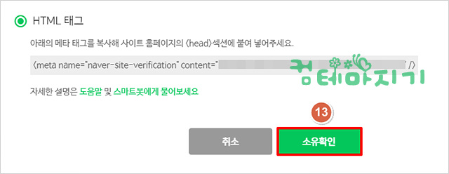 ▼ 티스토리 블로그에 메타 태그작업을 완료하고, 다시 네이버 서치어드바이저로 돌아와서 13. 소유확인을 합니다.